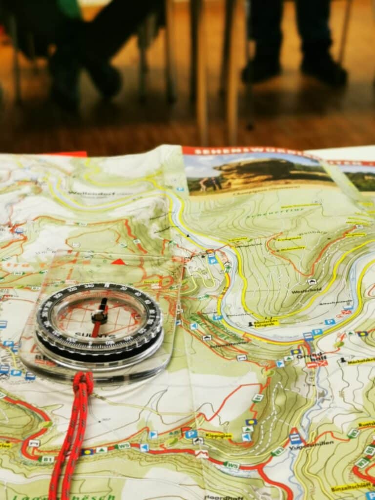 Nachmittags: nach dem Mittagessen in der Jugendherberge geht es an die Geheimnisse von Karte und Kompass: eine sorgfältige Einweisung schafft die Grundlage dafür, dass die Orientierungsrallye durch Wald und Feld zu einem spannenden und erfolgreichen Erlebnis wird.