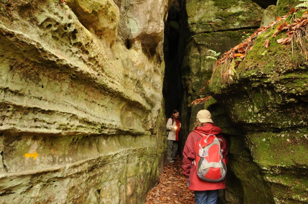 Die „Kuelscheier“ ist eines der geologischen Highlights der Region Müllerthal : eine stockfinstere und über 100m lange Felspalte welche über Treppen durch den Fels führt. Oben angekommen hat man eine herrliche Aussicht. Während der Wanderung zum Tagesziel zwängt ihr euch durch bizarre Felsformationen und schmale Felspassagen wie dem Rittergang und dem „Déiwepëtz“. Teeschenlampe nicht vergessen!