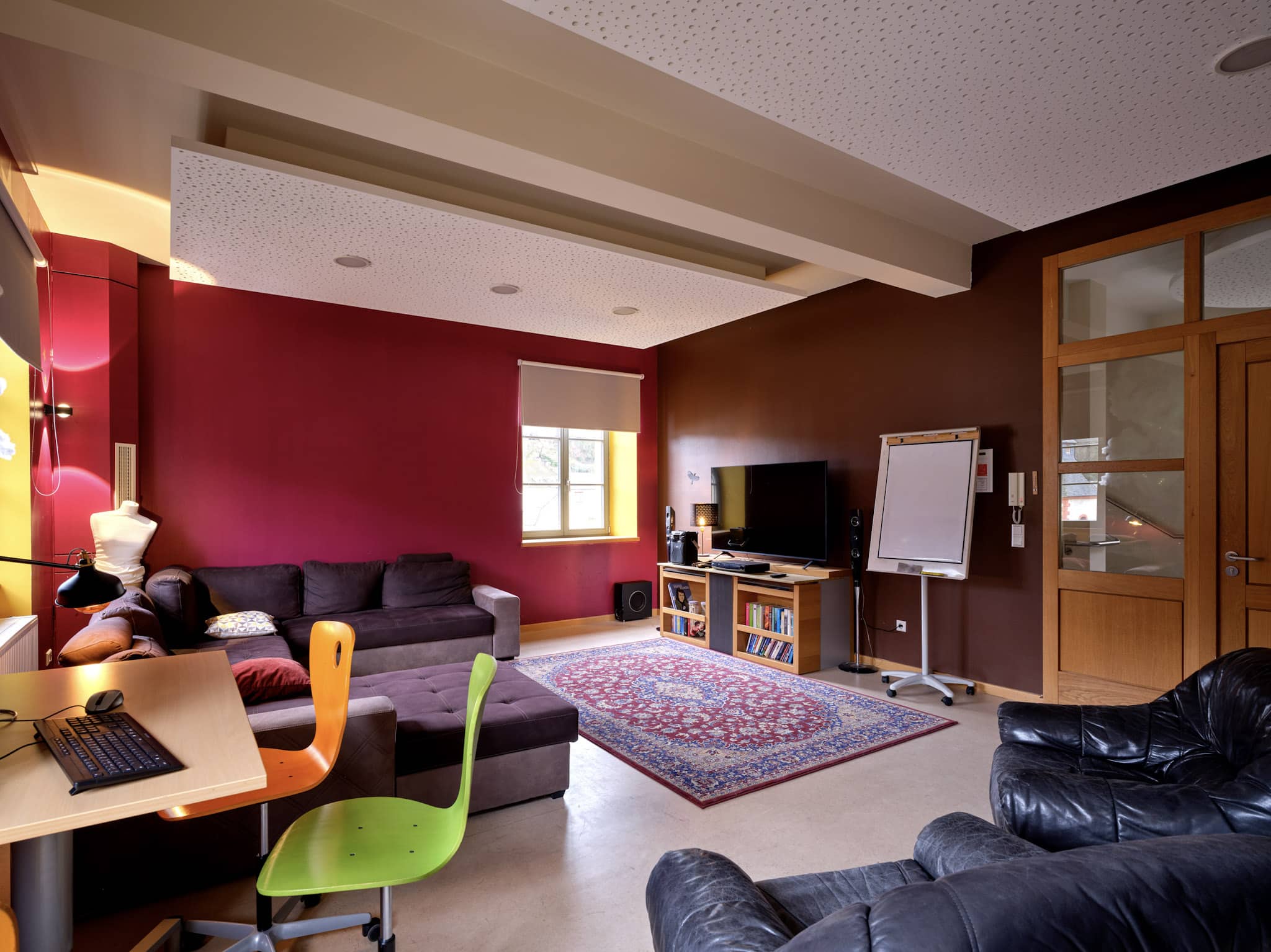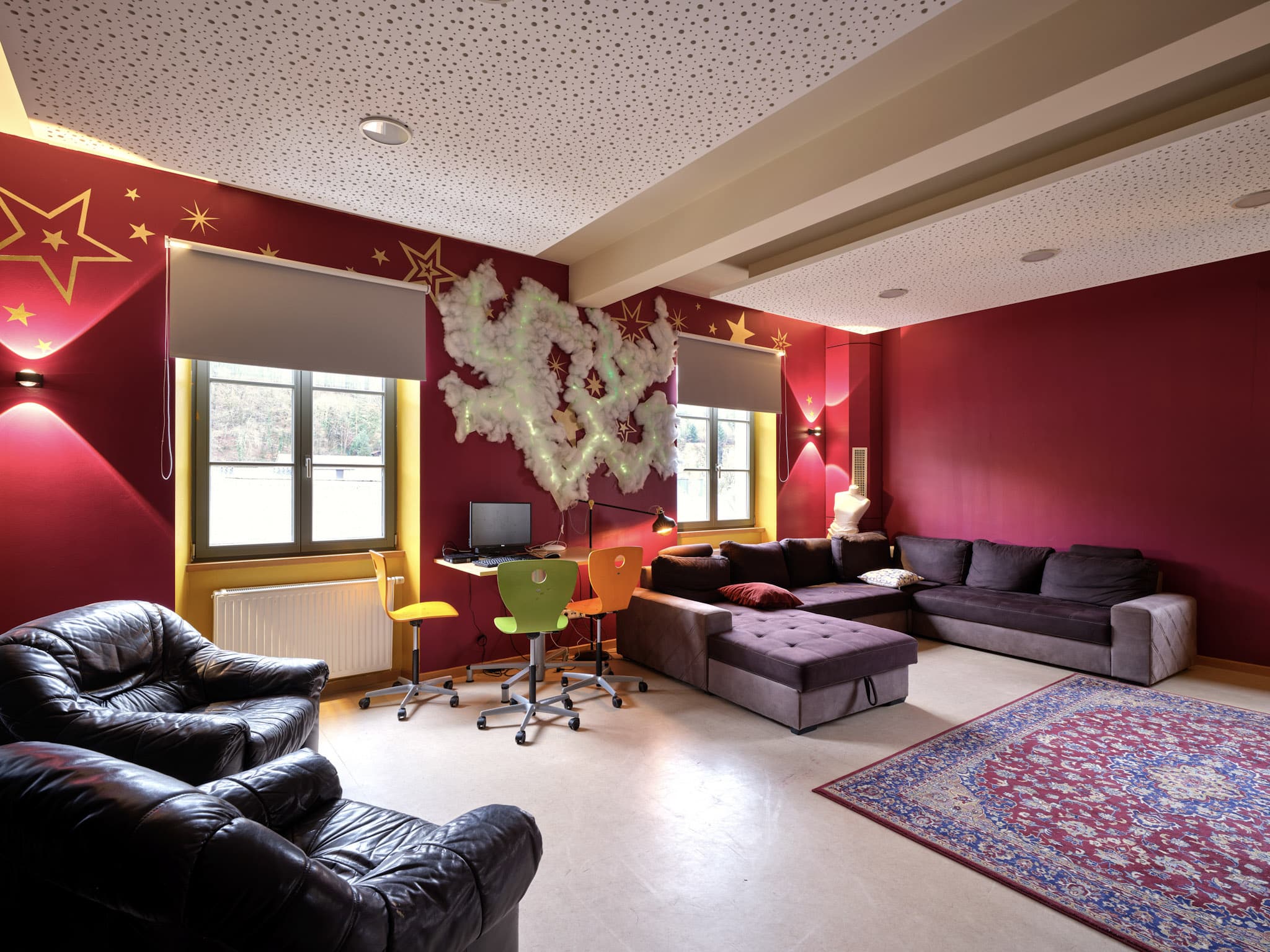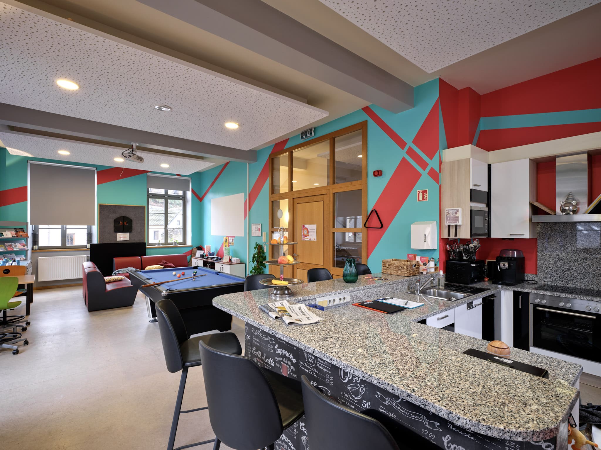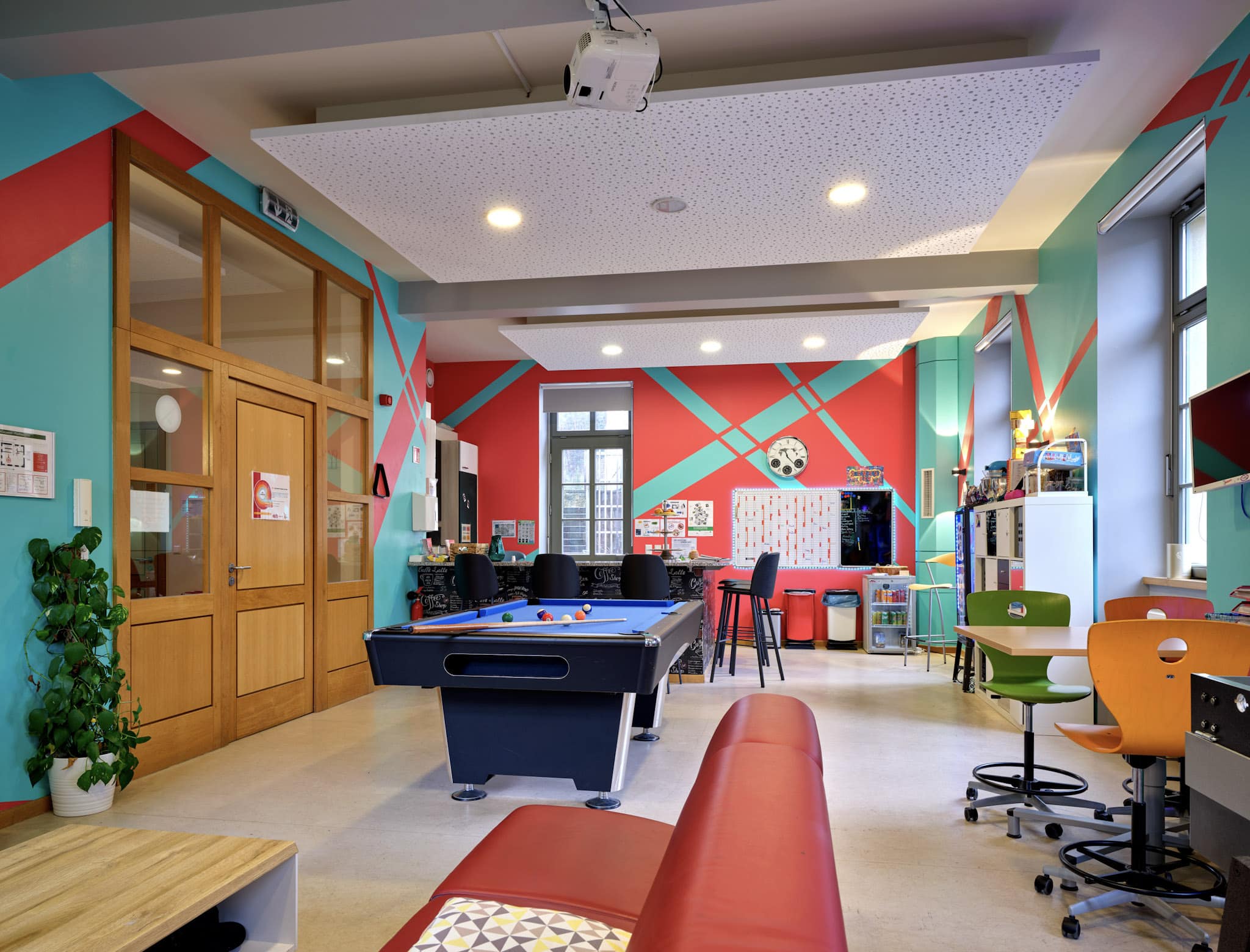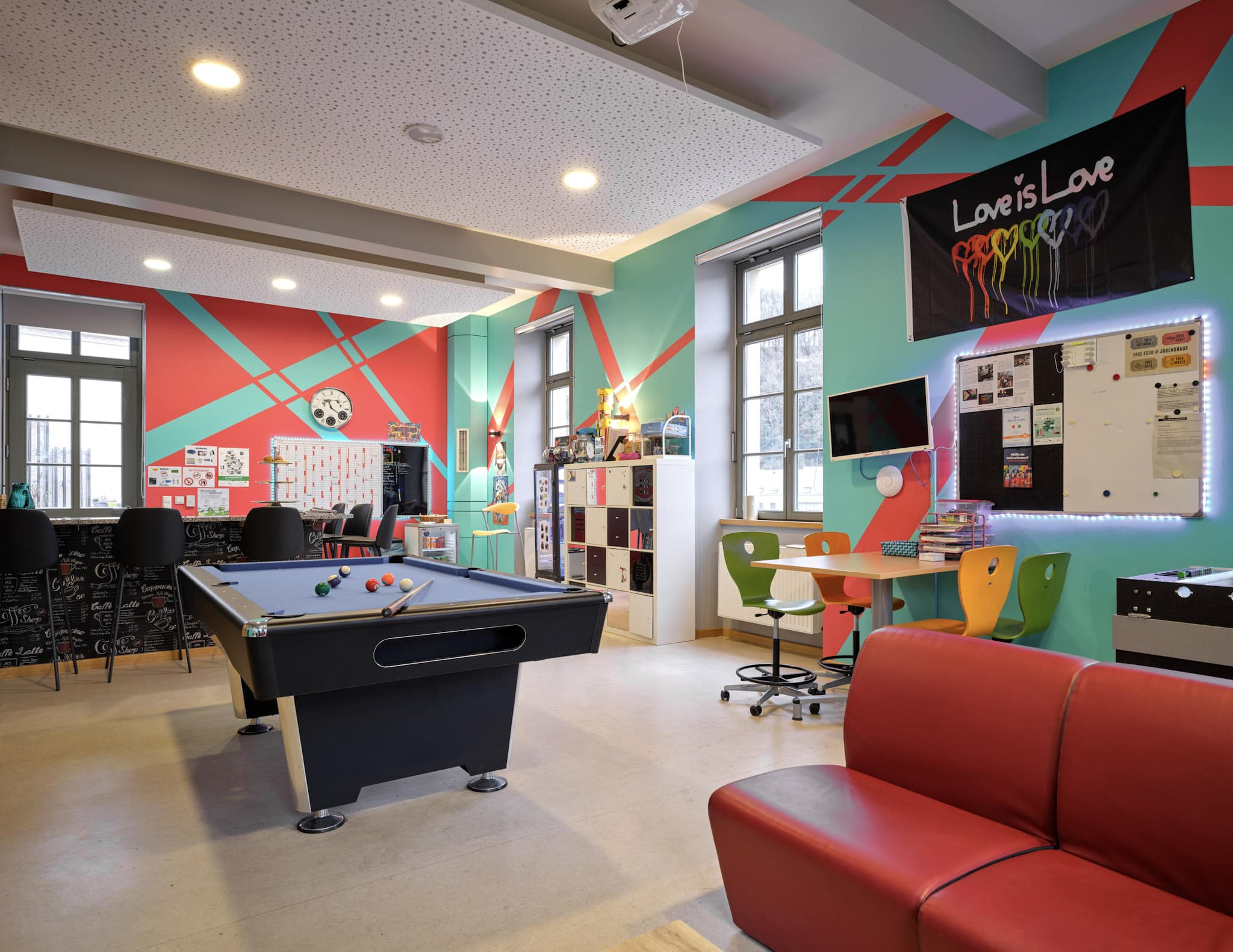 Das Jugendhaus verfügt über mehrere Räume, die auf die Bedürfnisse der Jugendlichen zugeschnitten sind. Im Erdgeschoss befinden sich die Büros der Erzieher.